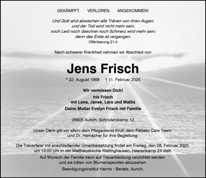 Auch wenn ich erst spät von der Nachricht erfahren habe, möchte ich euch sagen, dass meine Gedanken bei euch sind. Ich wünsche euch viel Kraft, Trost und Zuversicht in dieser schweren Zeit. Möge die Erinnerung an Jens euch Wärme und Licht spenden.